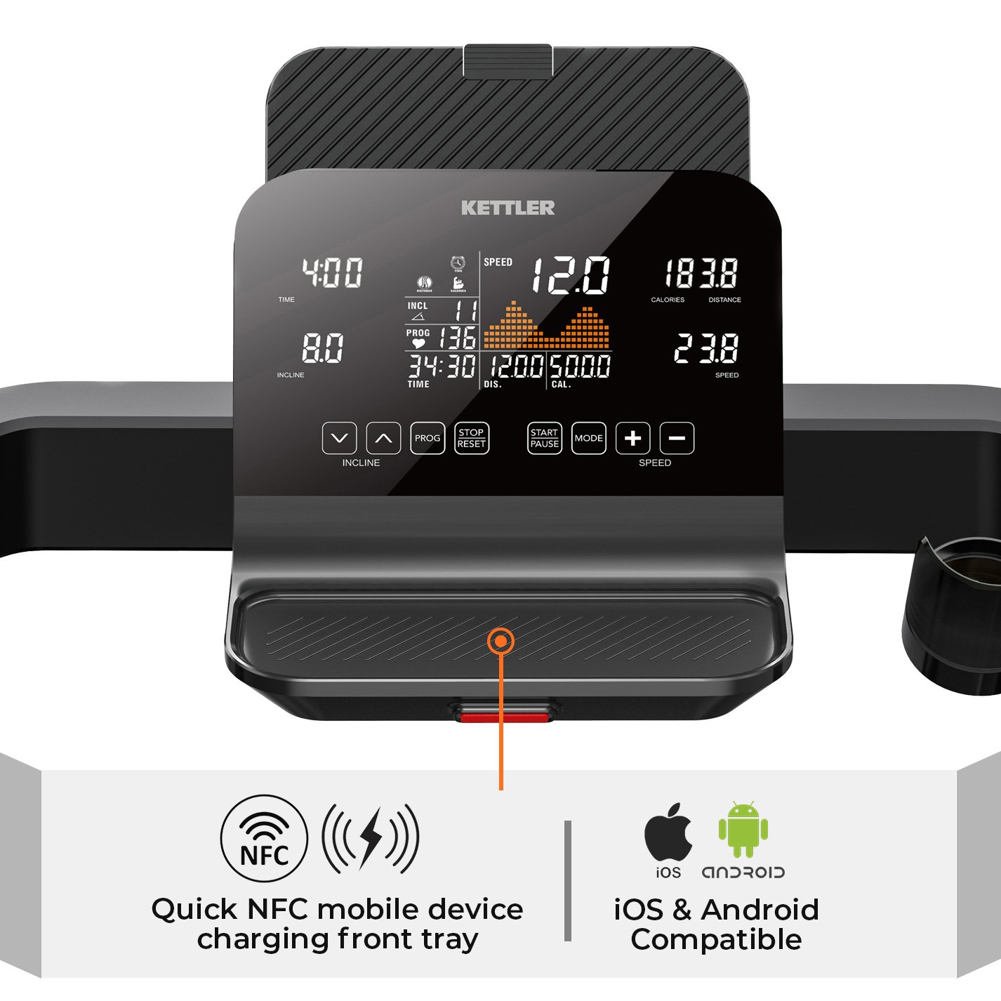 The KETTLER DORTMUND S2 is a new generation of treadmills based on entertainment and ease of use with NFC Wireless charging allows members to charge their personal devices while keeping their screens in view.
