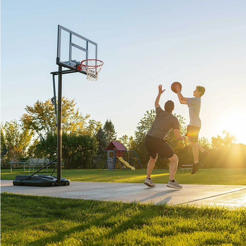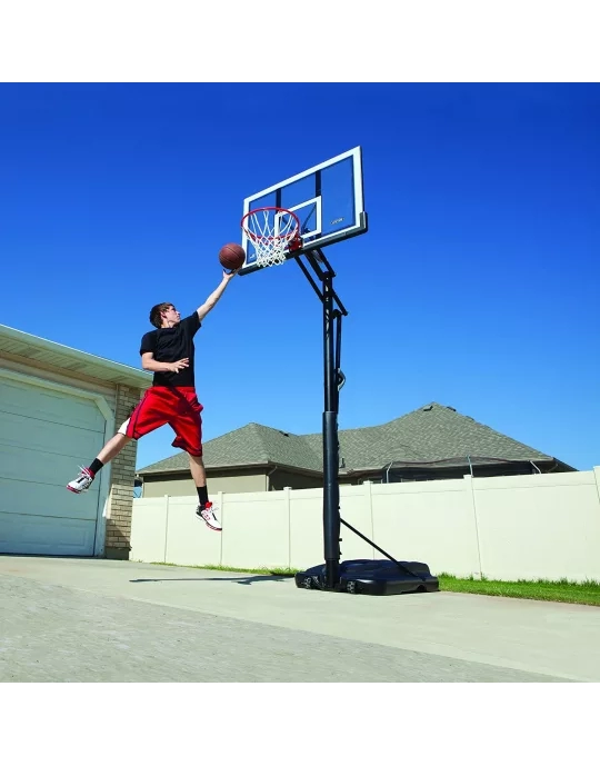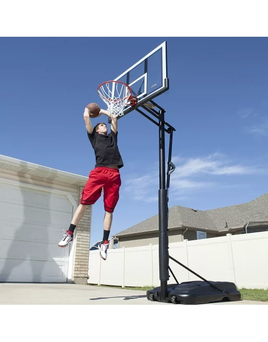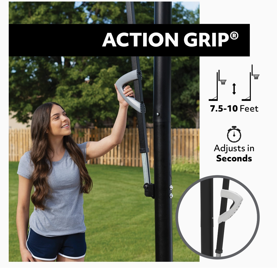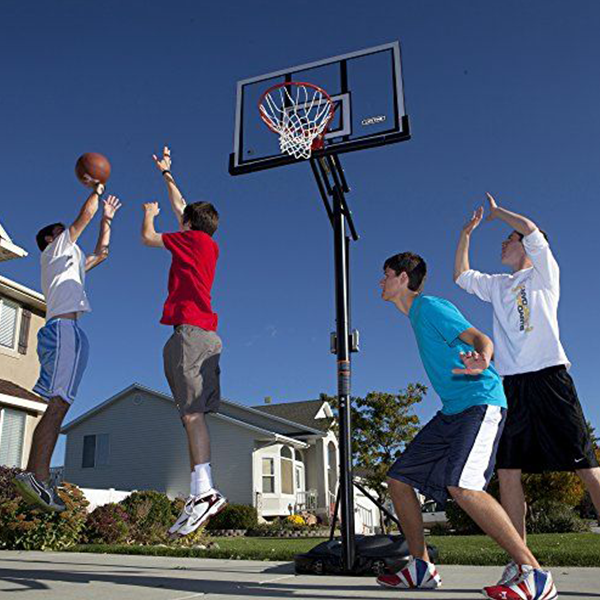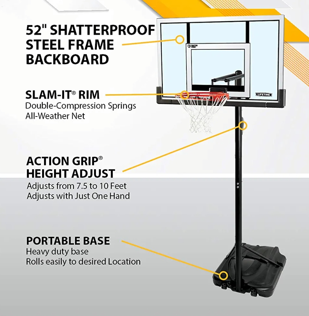 • This portable basketball system from Lifetime Products features a 52" Steel-Framed Shatterproof backboard with a Front Adjust height adjustment mechanism that adjusts from 7.5 to 10 feet high from a convenient, front-court location.