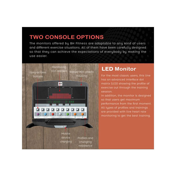 • Programs: 28 exercise profiles, manual program, customizable user program, Woman Fitness test, Man Fitness Test and HRC program (Heart Rate Constant frequency program.