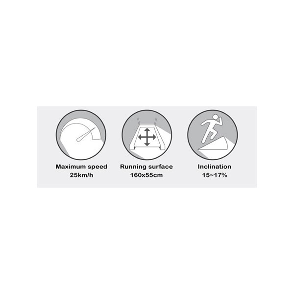 • On-screen information: Speed, Distance, Time, Calories, Pulse rate, Inclination, exercise profile.