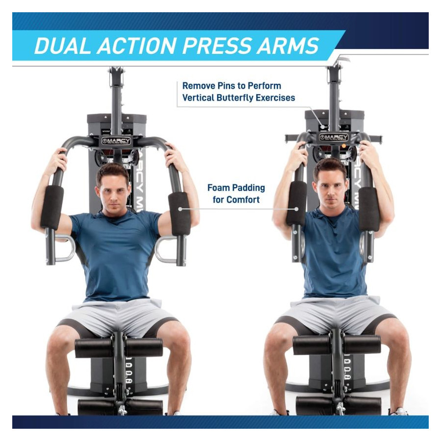 Dual action press arms allow for chest press and vertical butterfly exercises