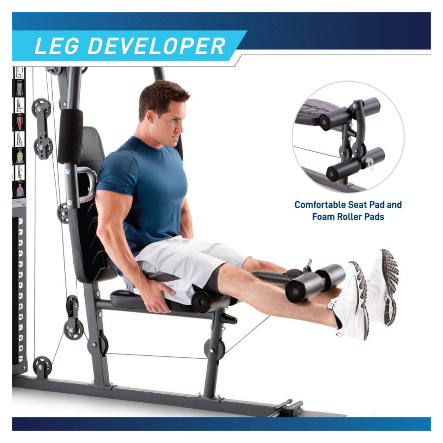 Work your lower body muscles with the total leg developer, also known as a leg extension. The included foam roller pads allow for a comfortable leg workout.