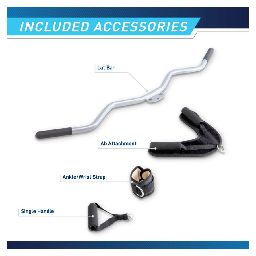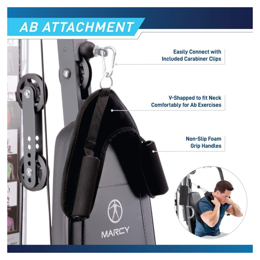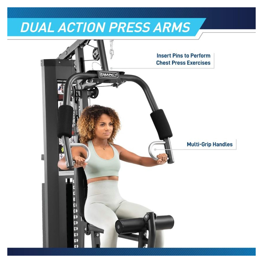 Throw out your gym club membership and save money with this high quality piece of equipment. The workout stations on the MWM-4965SC allow you to target multiple muscle groups with one piece of workout equipment. Use the Dual action press arms and upper pulley cable to workout your upper body. The lat bar will prepare you to move on to a pull up bar and the ab attachment will strengthen your core.