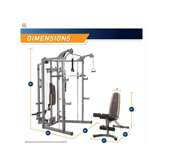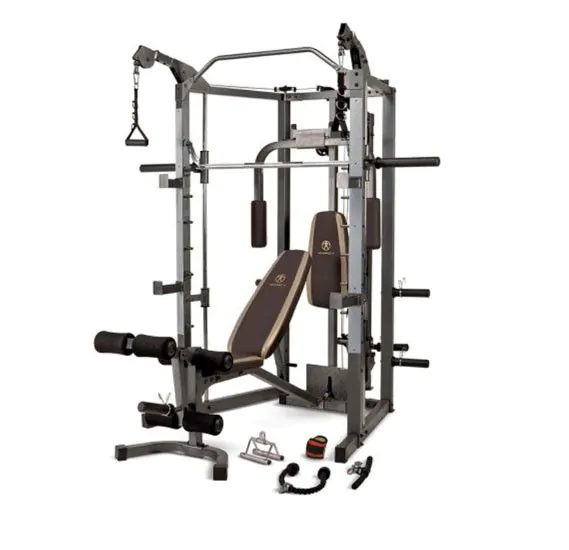 This all-in-one home gym equipment power house offers everything you need to tone and strengthen all major muscle groups. Get the best home gym with the Marcy SM-4008 Home Gym. The SM-4008 offers a full range of comprehensive resistance training options for all fitness goals. The press bar with adjustable safety stops allows you to perform a variety of powerful strength training workouts. These workouts include smith squats presses and more. Use the SM-4008 as a power cage by taking advantage of the pull-up bar for more upper body workouts. The unit also includes bar catches and safety catches to be used with an Olympic Barbell (sold separately. ) An independent motion upper pulley system allows for cable crossovers. The same pulleys vertical movement also provides resistance for the pec deck. And the pulley is not dependent on patented weight stack plates simply use the standard or Olympic plates you currently own. Continue building muscle throughout your body with the included leg developer. The leg developer allows you to strengthen your lower body through leg extensions and leg curls. The adjustable back pad expands your exercise options by providing multiple back pad angles. Transform your bench presses into an incline or decline bench press by adjusting the bench included with the SM-4008. The solid construction of the SM-4008 is made of 14-gauge square steel tubing. The structure itself includes four convenient storage posts. The storage posts make it easy to organize your plates within arms reach of your workout. This single piece of equipment offers a great full body workout for any fitness level. Working out at home doesnt need to be boring. Get a great workout that is versatile with the SM-4008 Machine.