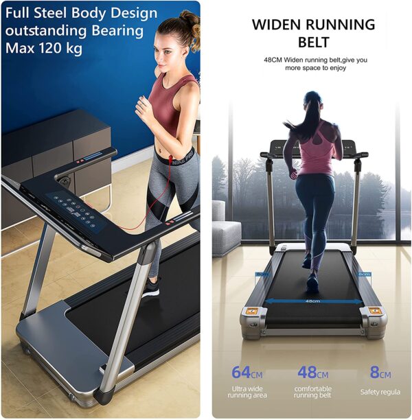 Heart rate foldable handrail, Bluetooth speaker, smart workout app if the multifunctional foldable handrail can bear 120kg. User capacity, measure heart rate, adjust the speed, better control your walking & running rhythm, much safer and, with BlueTooth speaker, you can listing to music or watching tv when running & walking and, monitor your home interactive personal training by smart workout app swift