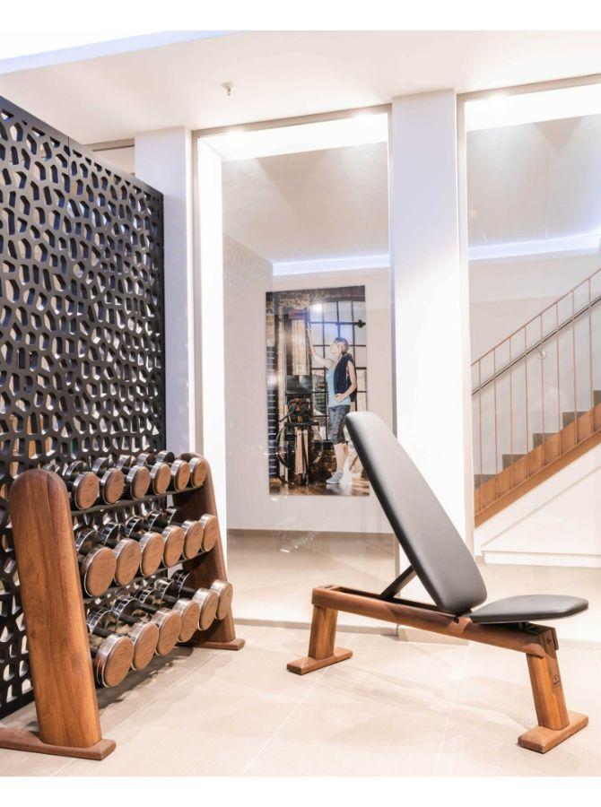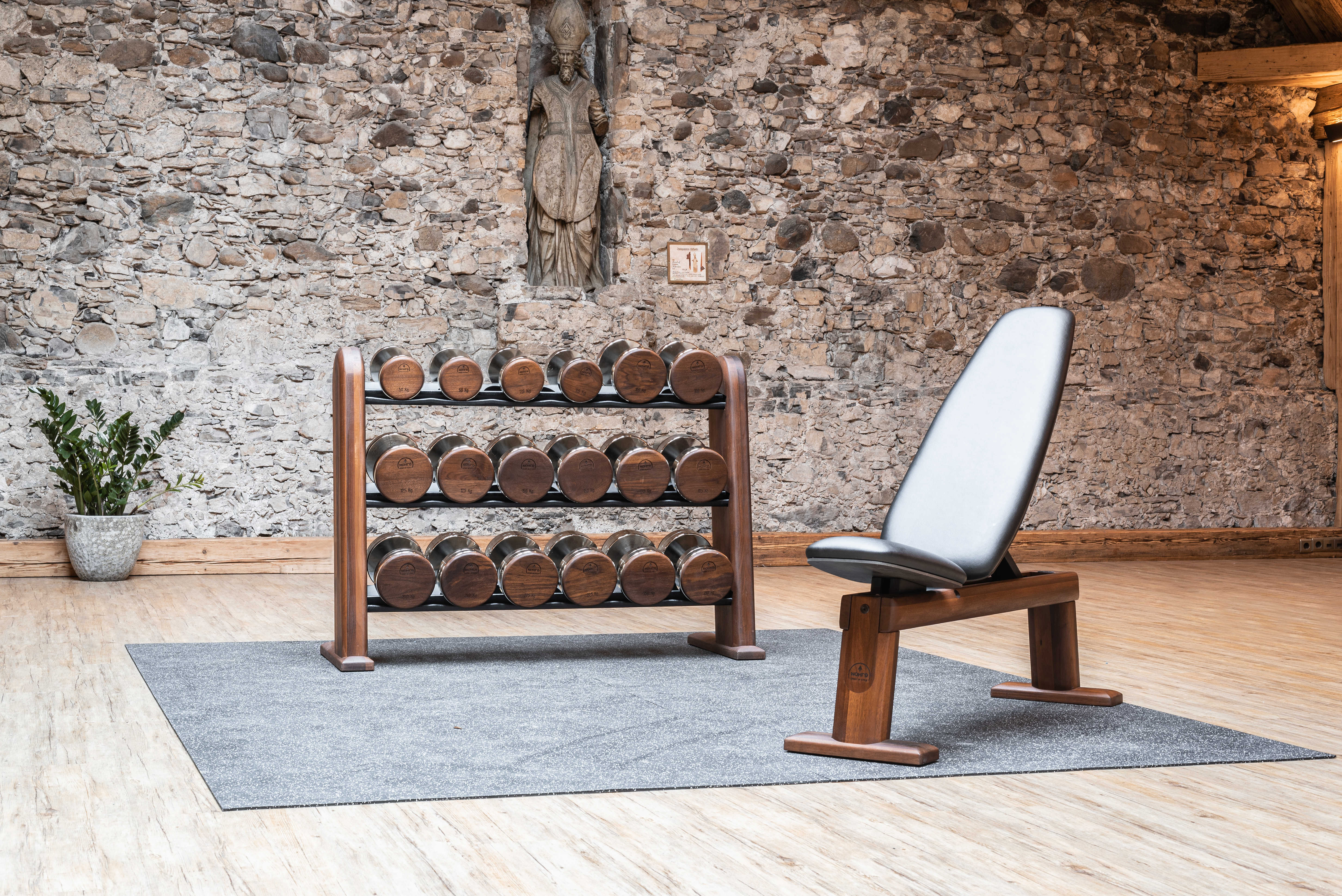 Multi adjustable wooden weight bench - NOHrD WeightBench The NOHrD WeightBench dumbbell training bench meets all the requirements of a functional training bench combined with an attractive aesthetic. The solid wood frame impresses with its stability and smooth contours. Handcrafted leather for the seat and bed (available in genuine leather) makes the bench an eye-catcher that blends effortlessly into any ambiance. • The WeightBench frame is made of solid wood, with a length of 128 cm and 35 cm width – distinct in its stability and smooth contours. • All upholstered surfaces are ergonomically shaped, providing optimal support for a full range of motion, up to over-the-shoulder area. A front-raised seat position allows a firm hold during your bench workout. • Ideal for bench press exercise: the NOHrD WeightBench supports up to 400kg (incl. dumbbells) total weight. • Quality engineering in every detail: the backrest can easily be set into eight different positions. • The seat setting offers two positions for optimal support during bench workouts. 6000 AED Walnut – 1