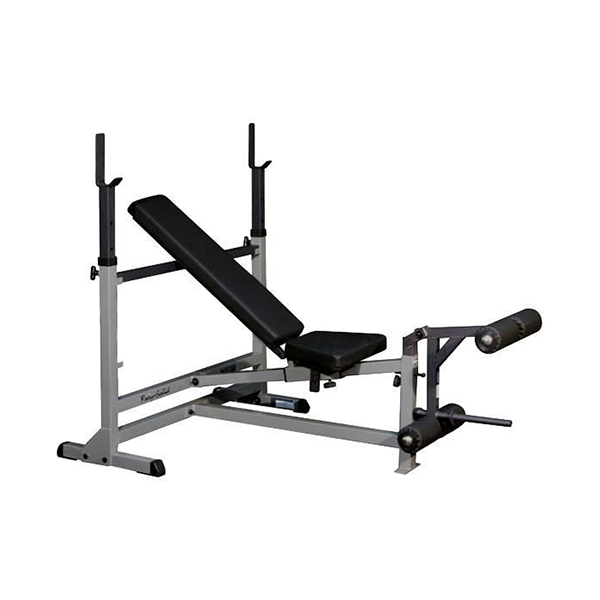 Body-Solid Power Center Combo Bench Get a total-body workout on the most versatile and complete combo bench available. The Power Center Combo Bench (#GDIB46L) is a Flat Bench, Incline Bench, Decline Bench, 90° Shoulder Press Bench, and a Seated Leg Developer all in one. You can see the dynamics of this bench as soon as you glance at the multi-position, telescoping uprights that safely hold the bar for bench exercises. The 6-position Flat / Incline / Decline / Bench features pop-pin adjustable DuraFirm" seat and back pads that are extra-thick, ultra-comfortable, and will never bottom out. The rock-solid strength and stability of the Power Center Combo Bench come from the extra-heavy 12-gauge all-4-side welded high tensile strength steel mainframe. Strengthen, tone, and develop your knee, thigh, hamstring, and glute muscles with the six-roller Leg Extension / Leg Curl Station included with the Power Center Combo Bench. Thick, oversized foam rollers provide complete comfort through heavy lower body routines. Weight plates, bar,s and collars optional