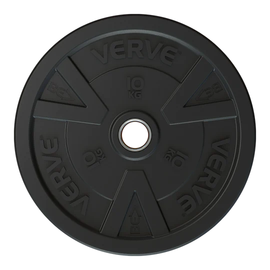 VERVE BE> (Be Greater Than) Bumper Plates have been rigorously tested by coaches and athletes and are suitable for any type of workout. The stainless steel inserts fit tightly on all Olympic size barbells. Created from durable 100% rubber, the VERVE bumper plates are designed for low bounce and high durability.
