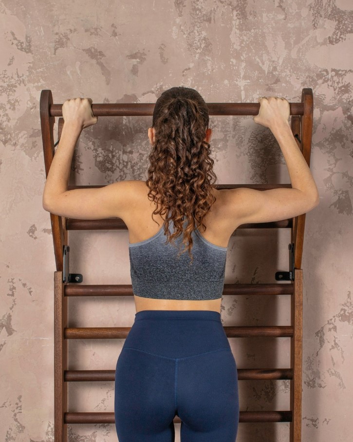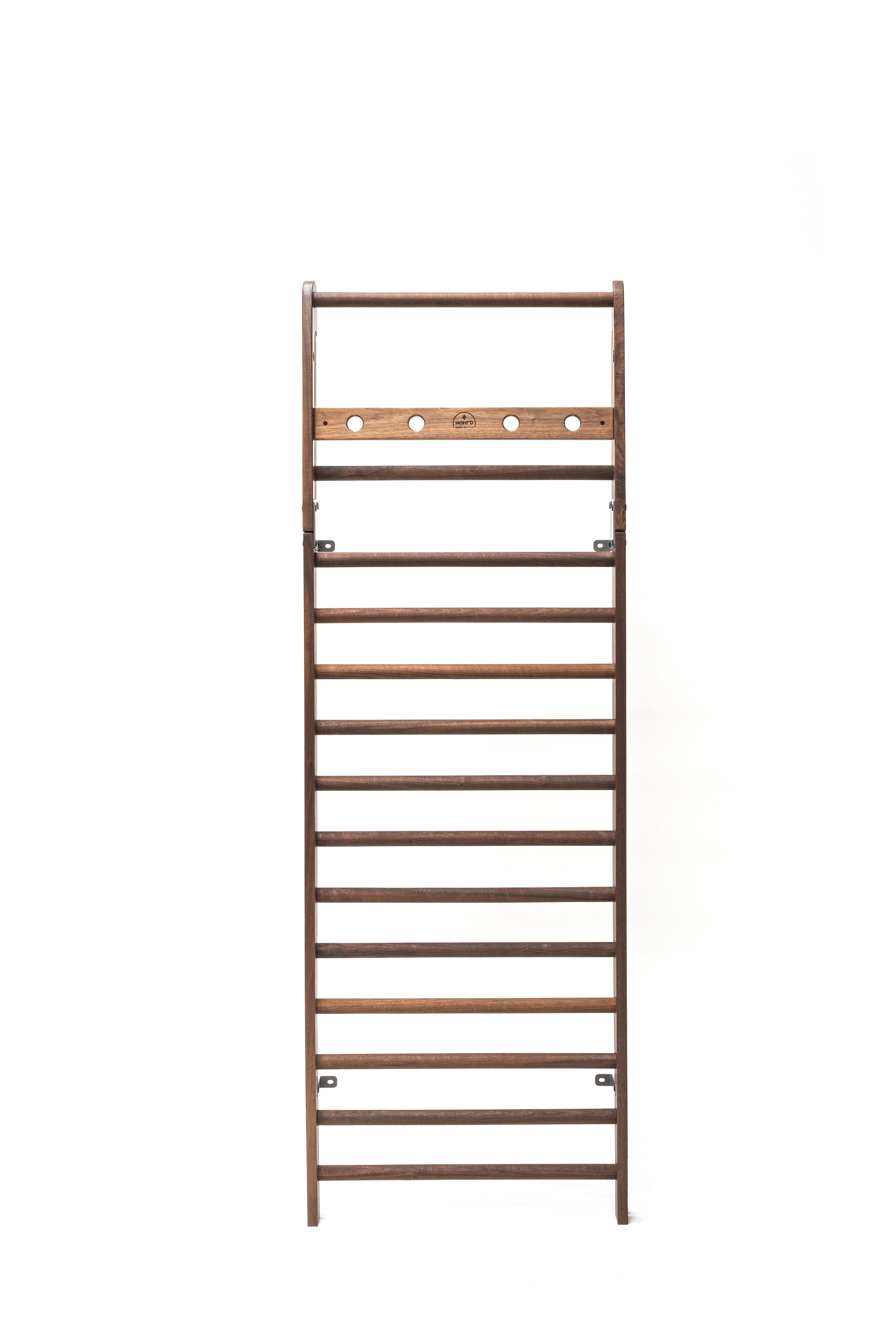 NOHrD WallBars, a classic piece of fitness equipment for multi-functional exercise, featuring a unique overhead foldout bar to expand your workout range. Ideal for hanging or pull-up exercise, the foldout bar clicks into position when opened, providing the necessary stability and space for hanging and swinging exercises. Elegant, sturdy and strong, the WallBars is the perfect allrounder and space-saver combined. • The rungs are made to enable a comfortable grip and the entire unit will sustain a maximum weight of up to 120kg / 265 lbs without any problem • NOHrD WallBars have been manufactured to sustain full weight and adhere to highest quality workmanship standards. • The WallBars is ideal for all areas of fitness training, especially strength building, mobility, and coordination exercise. • Made of solid wood and fitted with a durable cord for the foldout bar, the WallBars is ideal for the multi-functional workout.